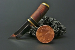 Zur Herstellung dieses Messers habe ich zunächst das Endstück eines abschnittenen Klingenerls aus 3-Lagen-Stahl zu einer winzigen modernen Tanto-Klinge, wiederum mit einem Erl, ausgeschmiedet. Anschließend habe ich die Klinge von Hand auf Wassersteinen geschliffen und geschärft. Das Anbringen der einzelnen Teile des Griffs erforderten ganz besonders viel Fingerspitzengefühl. Insgesamt habe ich fast drei Tage an dieser Miniatur gearbeitet. Dabei ist sie mir so ans Herz gewachsen, dass ich sie nicht verkaufen möchte! :-)